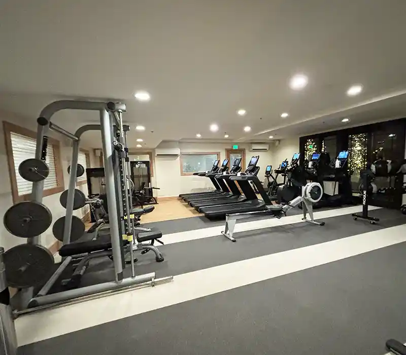 No andar inferior do spa, há uma academia completa 24h. O espaço conta com equipamentos de musculação, esteiras, e salas para yoga e spinning (com bicicletas Peloton).