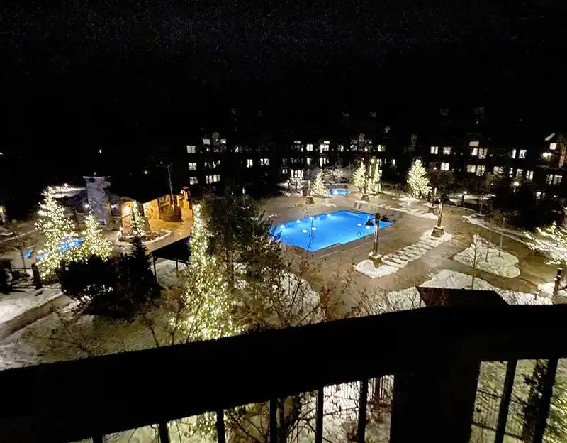 A vista da varanda dava para a piscina com as montanhas ao fundo — um verdadeiro sonho de Natal.