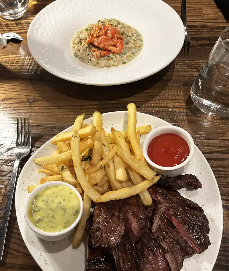 Todas as refeições (café da manhã, almoço e jantar) são servidas lá. No meu jantar, pedi Wagyu com fritas e também provei o risoto de lagosta. Ambos estavam deliciosos e impecáveis.